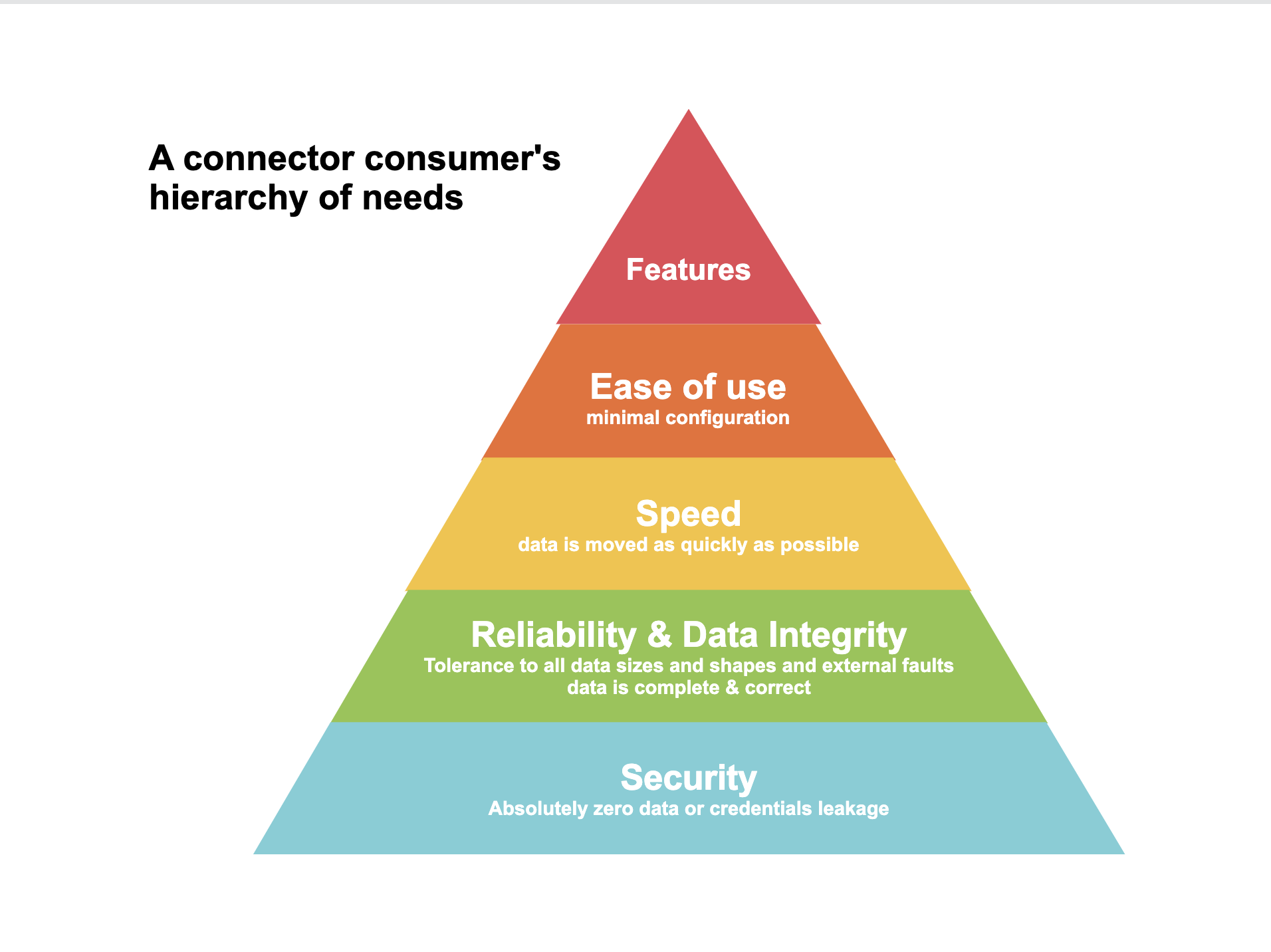 A connector needs to be reliable. Otherwise, a user will need to spend a lot of time debugging, and at that point, they’re better off using a competing product. The connector should be able to handle large inputs, weirdly formatted inputs, all data types, and basically anything a user should throw at it.